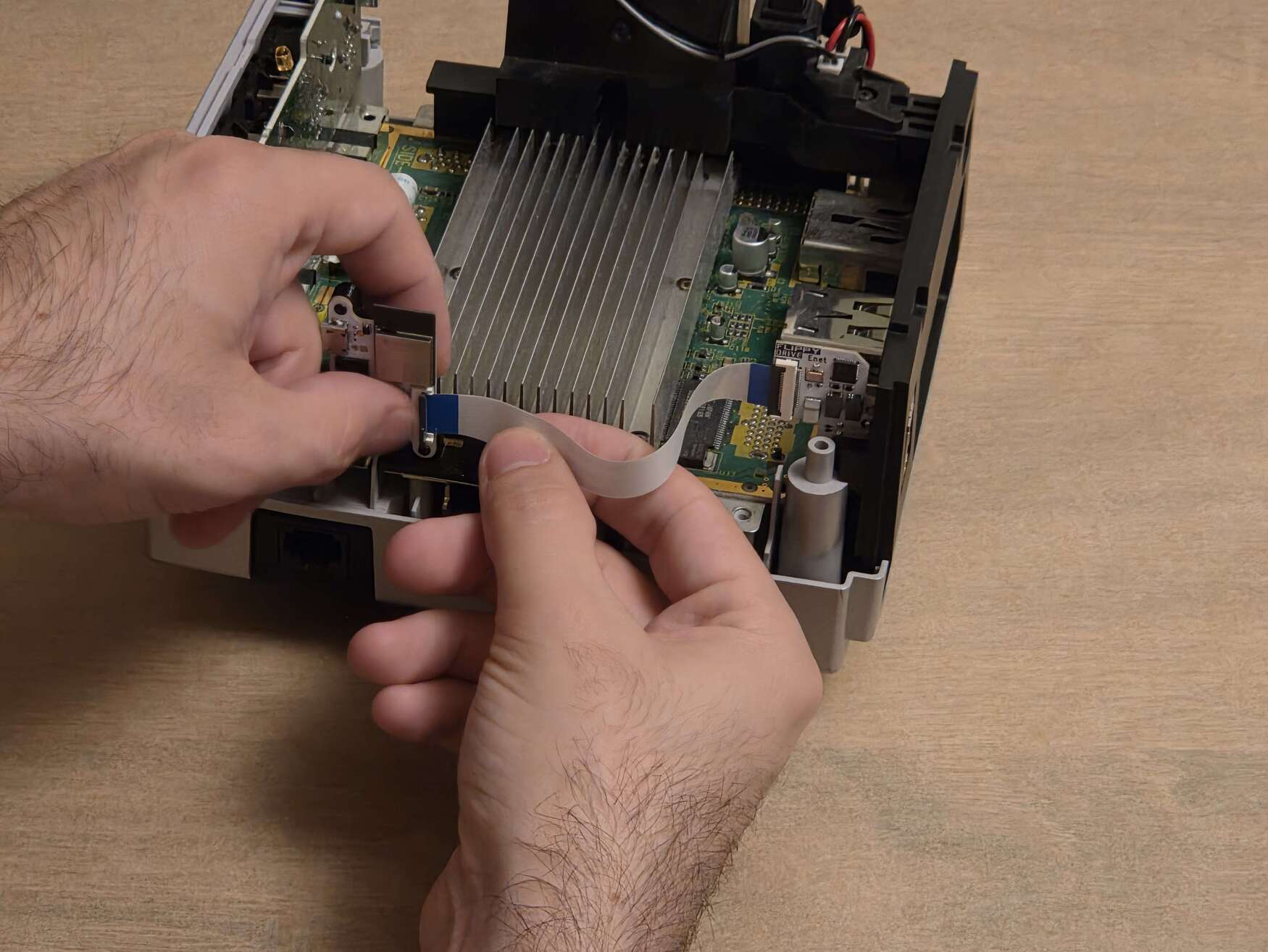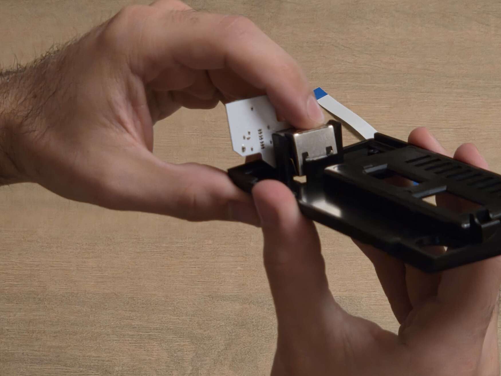 Insert the ribbon cable, with the blue side of the ribbon cable facing up on both sides.